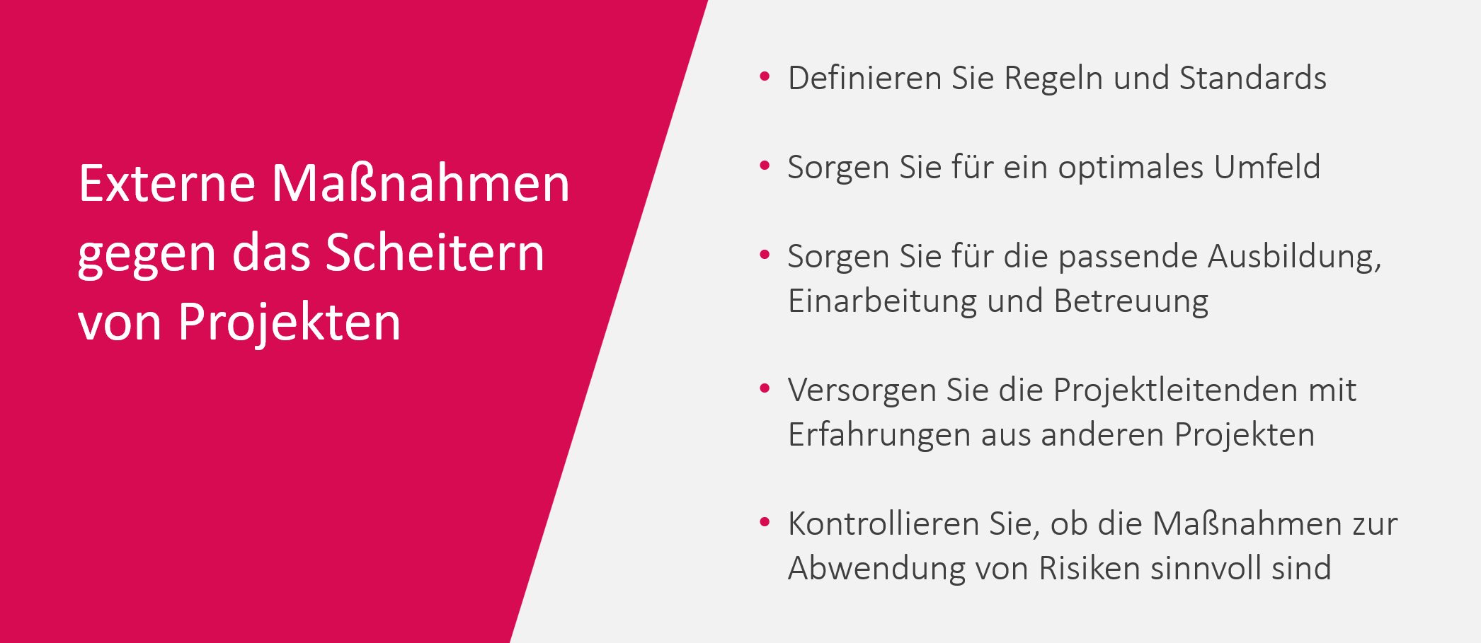 Allerdings sind die Möglichkeiten der Gegensteuerung intern anders. Sie können auch im Bereich des PMO liegen. Hier gibt es viele Ansätze, wie Sie planmäßig Gründe des Scheiterns reduzieren bzw. ausschalten können.