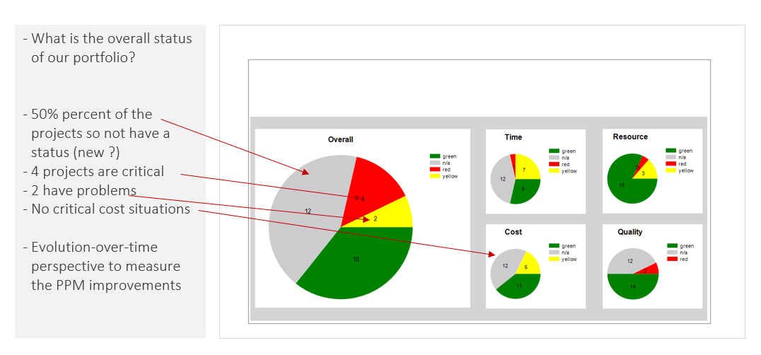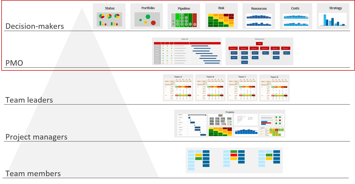 Good PMO reporting with the right PMO reports will allow target groups to discern the current state in their project environment quickly. Decision-makers should see at first sight what they have to decide. This saves valuable time and effort.
